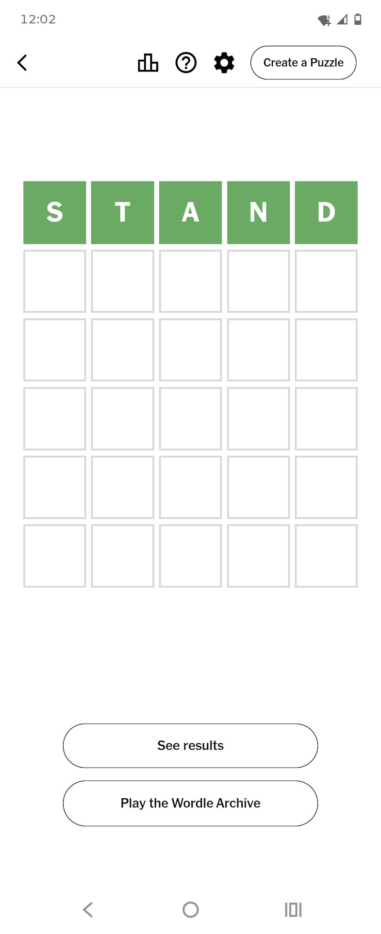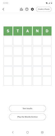 I also started doing the granddaddy of their games, Wordle. Everyone has their favorite starter word; mine is STAND, and my second word, if nothing in STAND hits, is COVER which has worked out pretty well. I’ve finished 218 with a 95% solve rate; well, last Sunday this happened. –>