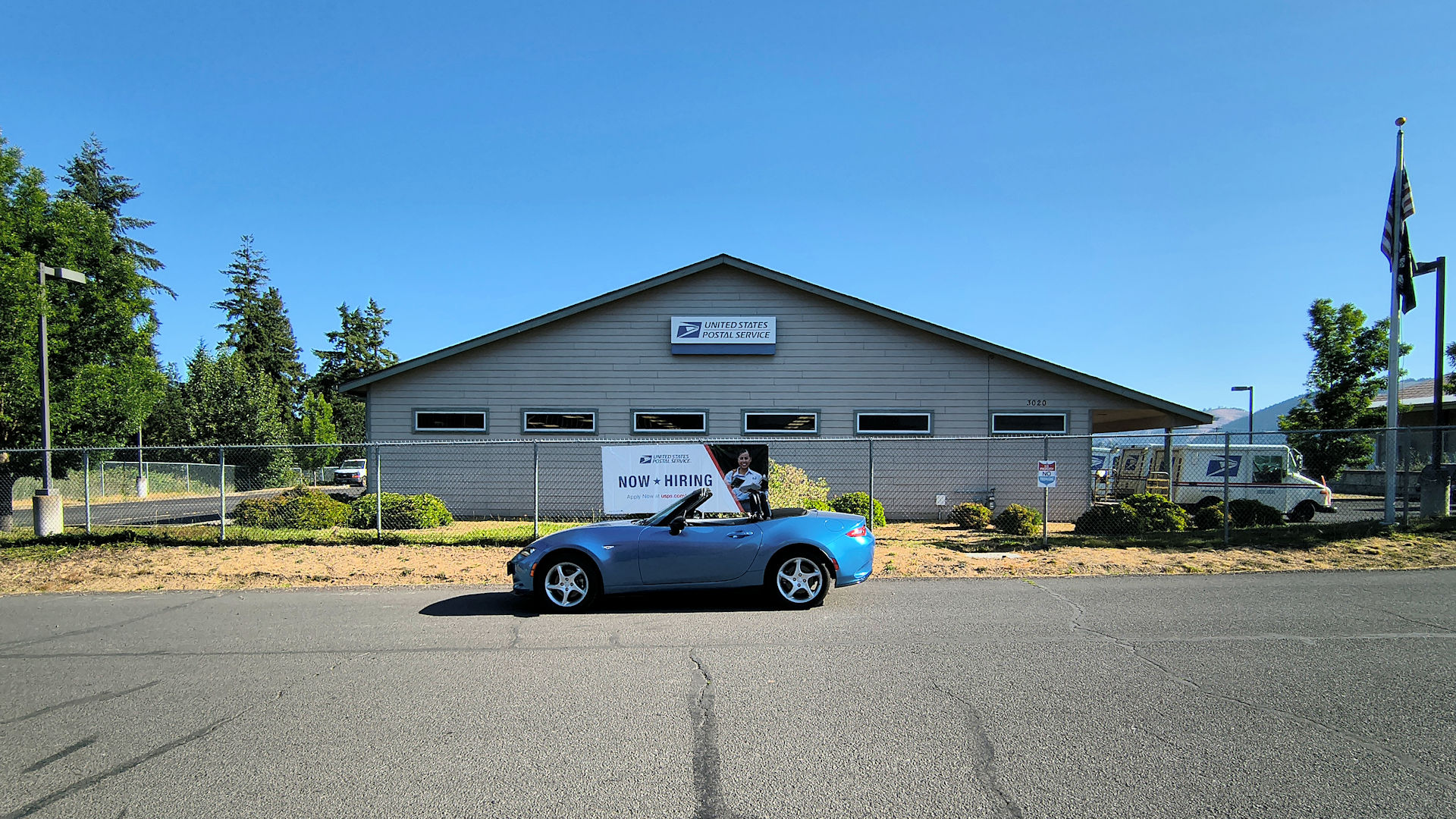 Brightwood – Although this photo is of the Post Office it looks like it is a photo of a Miata with a government building behind it. (6/29/25)