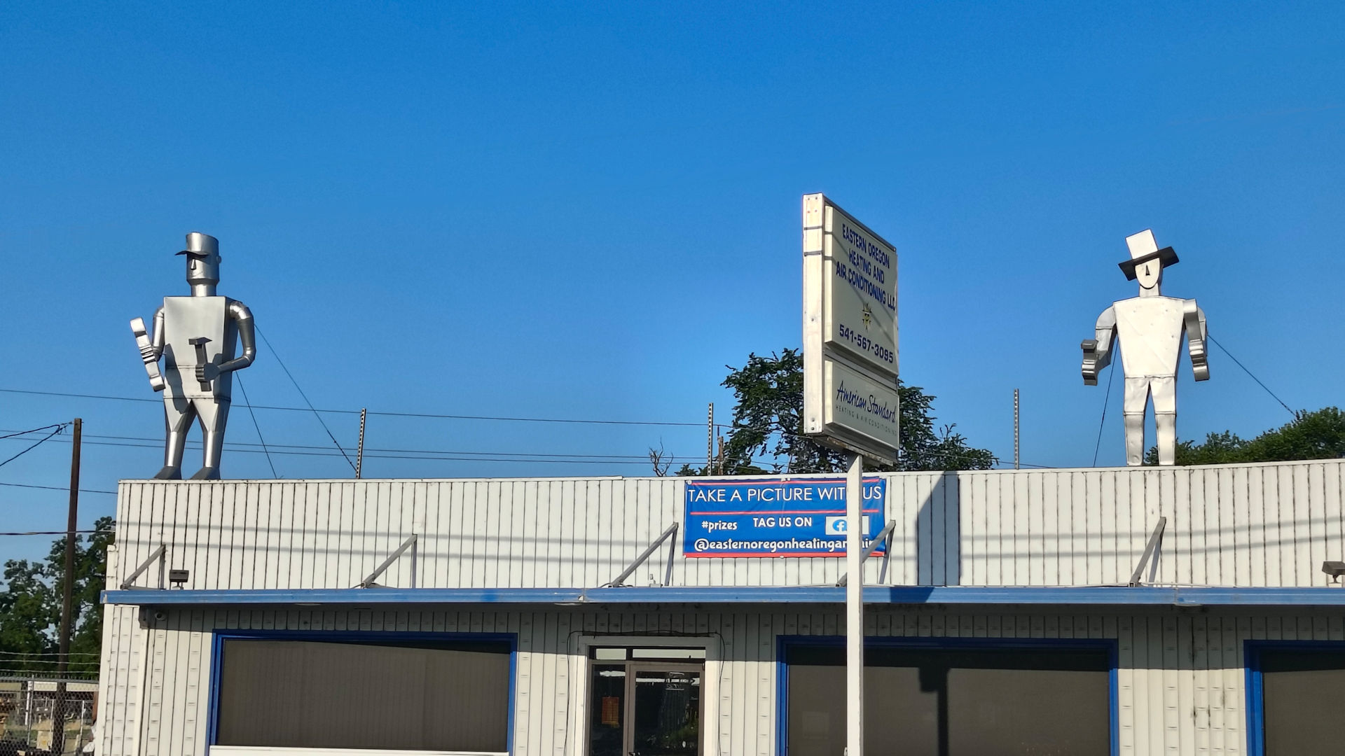 All three of today’s Roadside America photographs happened in my home state of Oregon. Both the first two Metal Men on a Roof and the Large John Wayne Figure, although I see no resemblance, are located in Umatilla. Number three, the Tugboat On Land is grounded in the town Boardman.