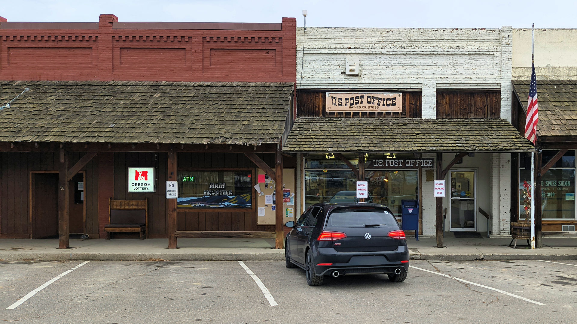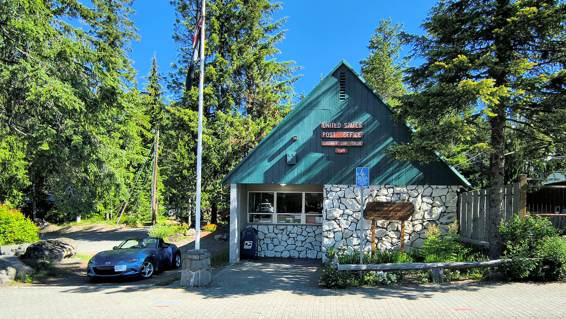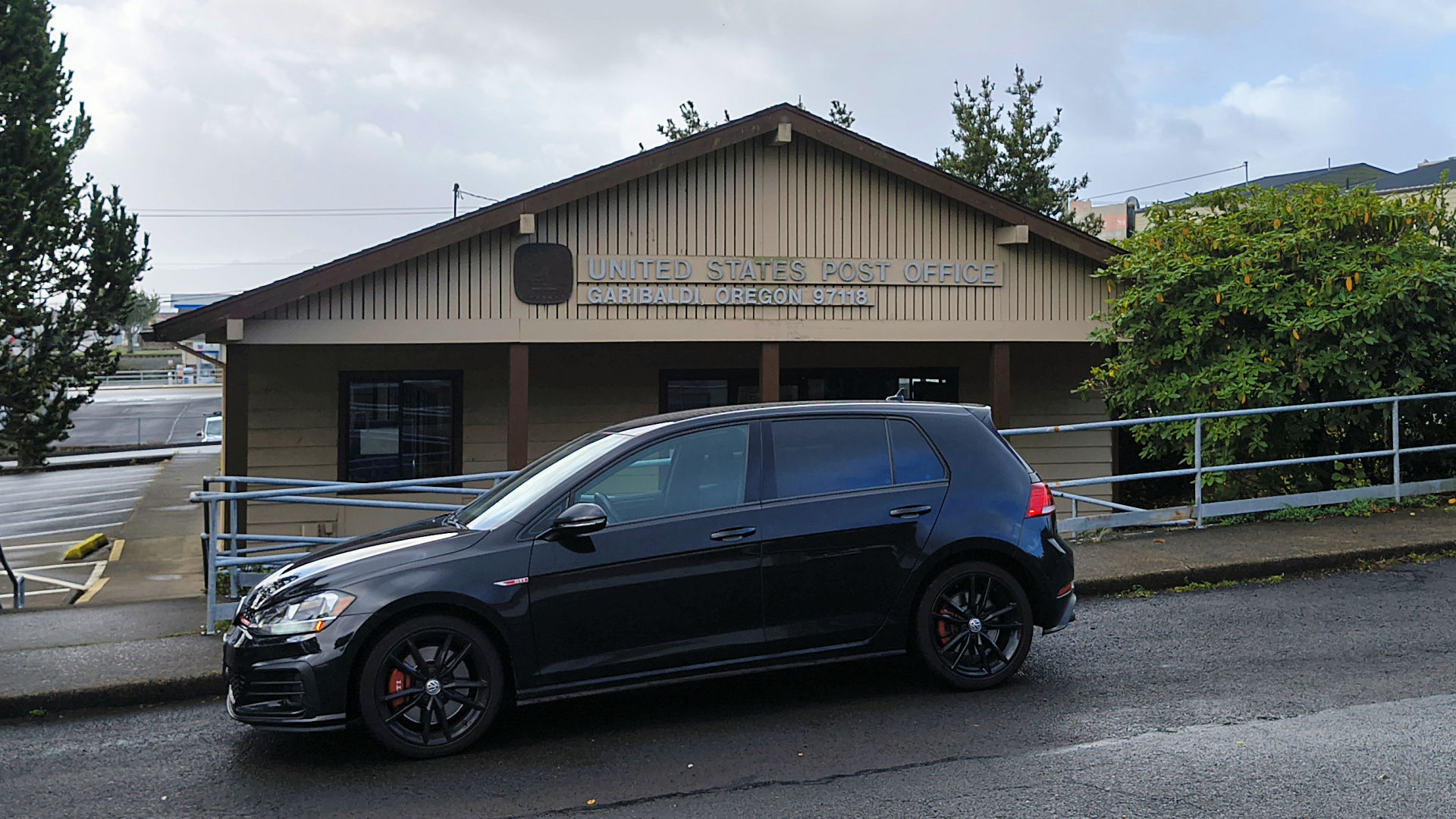Gleneden Beach - See those two blue doors above the roof of the GTI? That is the entrance to the post office and there is a sign saying so but it is in the shadow. (3/1/26)