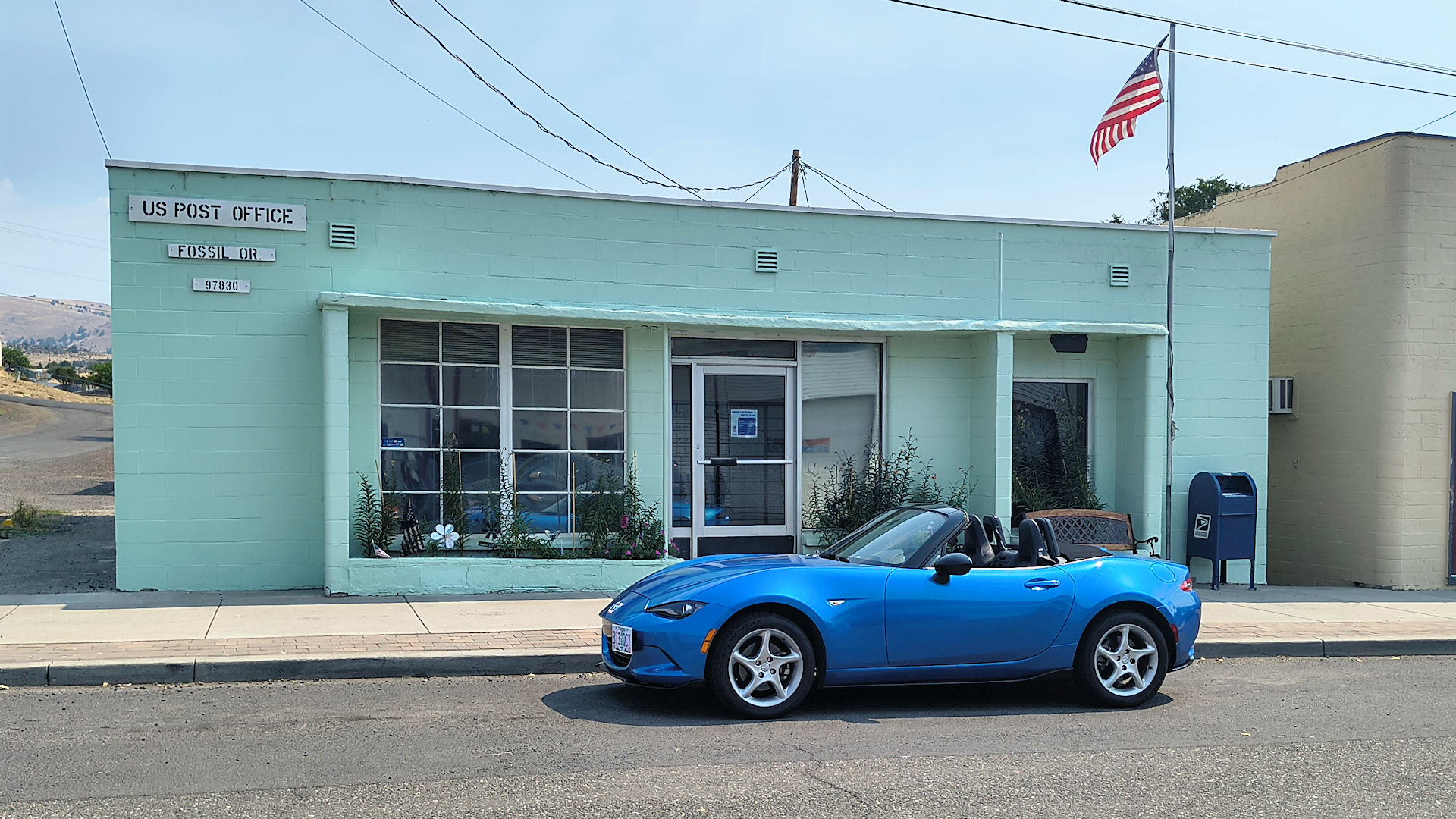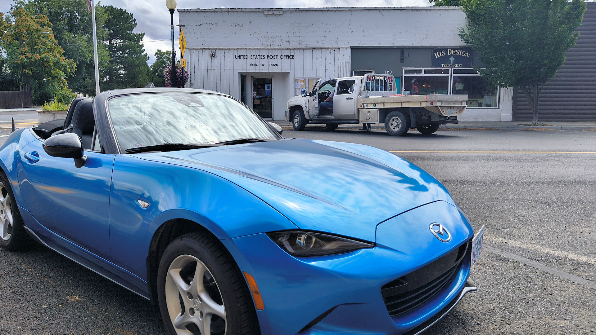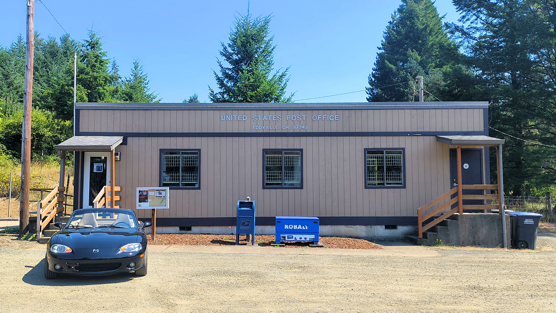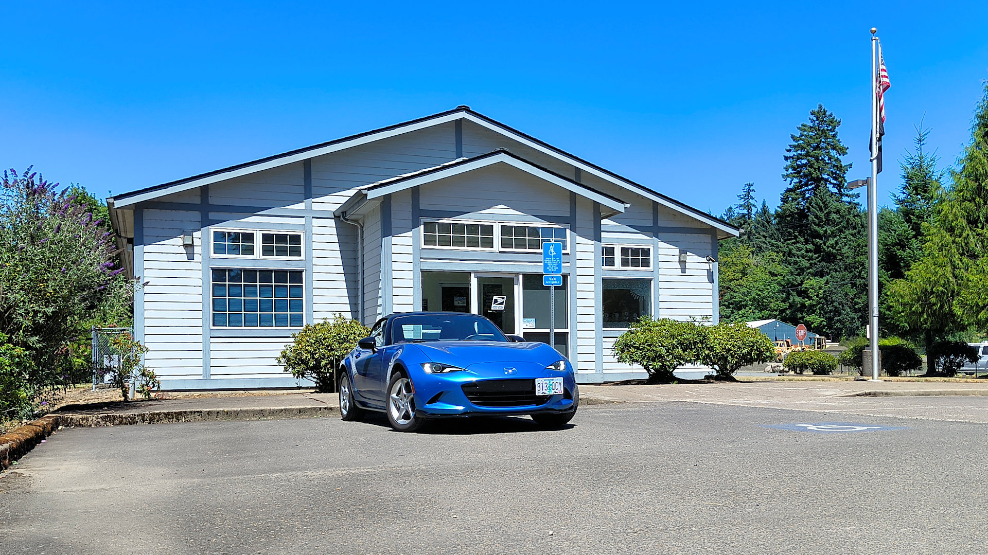 Gleneden Beach - See those two blue doors above the roof of the GTI? That is the entrance to the post office and there is a sign saying so but it is in the shadow. (3/1/26)