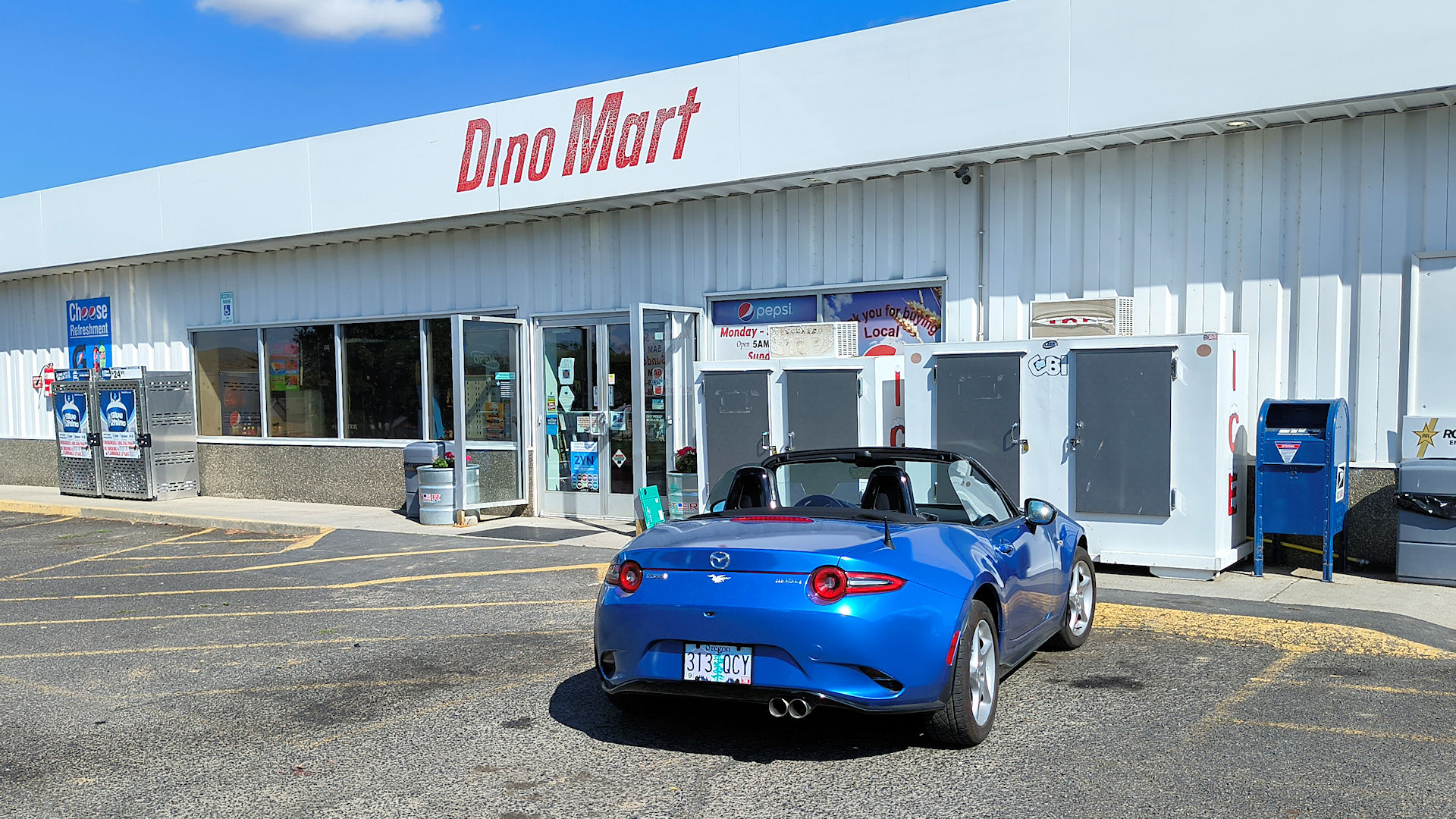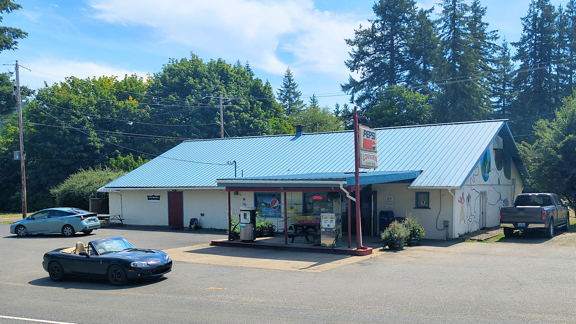 Logsden - Post Office number two today where it is inside the country store. The pickup is the proprietor's and the Prius belongs to a little old lady. I sat at the picnic table and had a Snickers ice cream bar. (8/23/25)